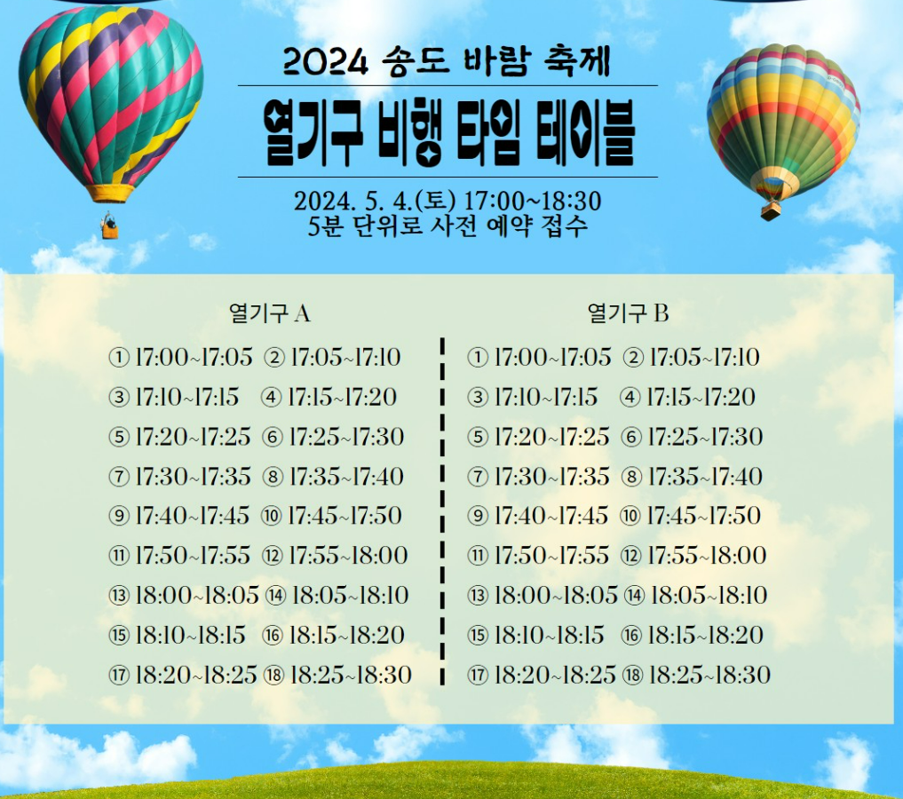 열기구 비행은 약 5분단위로 이루어지며, 열기구 두대로 각각 18팀씩 총 36팀의 접수를 받을 예정입니다. 시간도 미리 생각해두시고 잘 체크해 둔다면, 조금 더 빠르게 예약할 수 있을 것 같습니다.