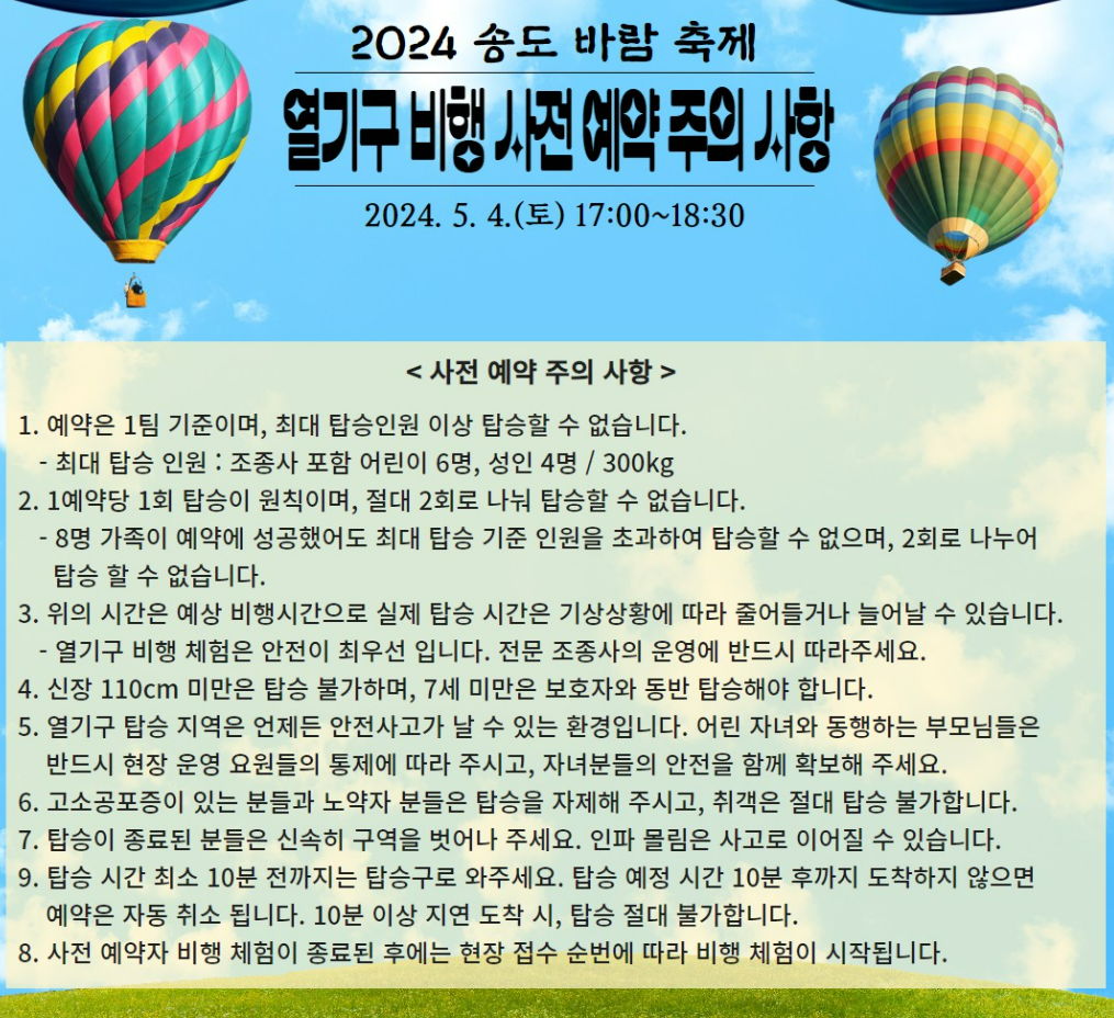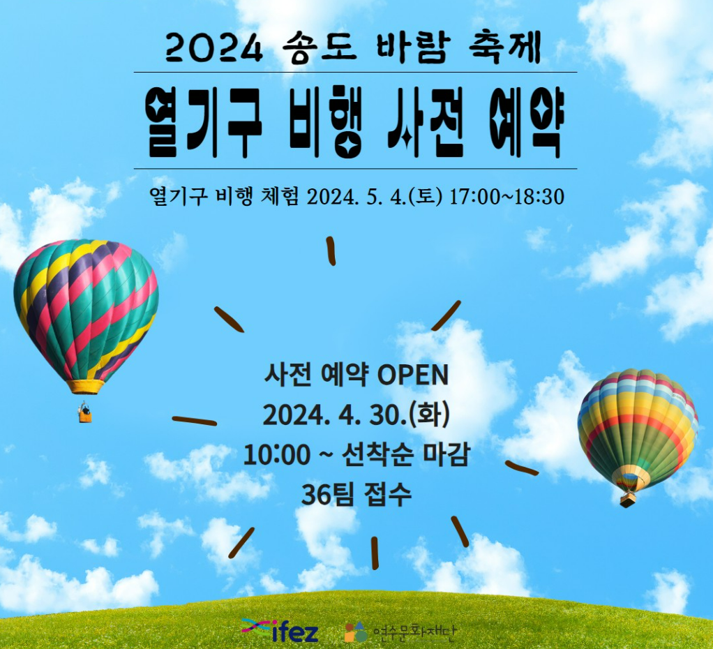 저는 가족들과 함께 시골에 내려가야해서 일정이 맞지 않아서 예약을 하지 못하게 되었지만, 아이들에게 짧고 굵은 경험을 하게 해 줄 수 있는 이벤트가 있어서 소개해드리려고 해요. 바로 2024년 송도 바람축제를 통해서 열기구 비행 경험입니다.