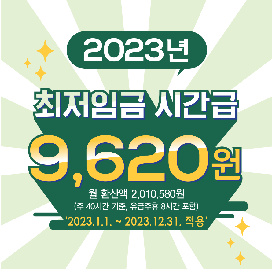 2023년 적용 최저임금은 시급 : 9,620원 (전년대비 460원 인상) / 일급 76,960월 (일 8시간 기준) / 월급 2,010,580원 (주40시간, 유급주휴 8시간 포함) 입니다. 주급 수당의 경우는, 9,620원 × 내가 일한 시간을 계산하면 주급 주휴수당을 계산하실 수 있습니다.